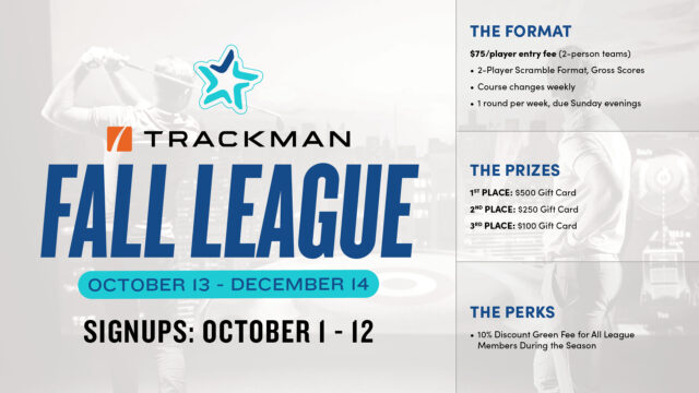 Oct 13 – Dec 14 | Tee off in the ultimate indoor golf experience this fall with our Fall Golf League! Compete with friends in a 2-player scramble format with new courses weekly, followed by playoffs to see who comes out on top.